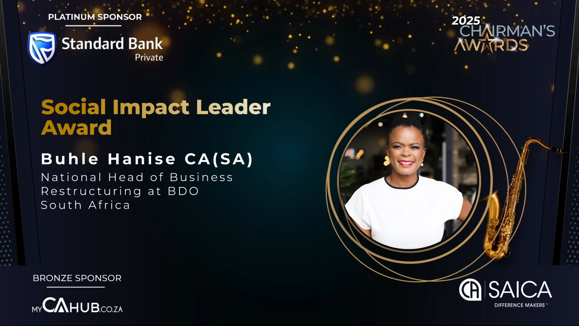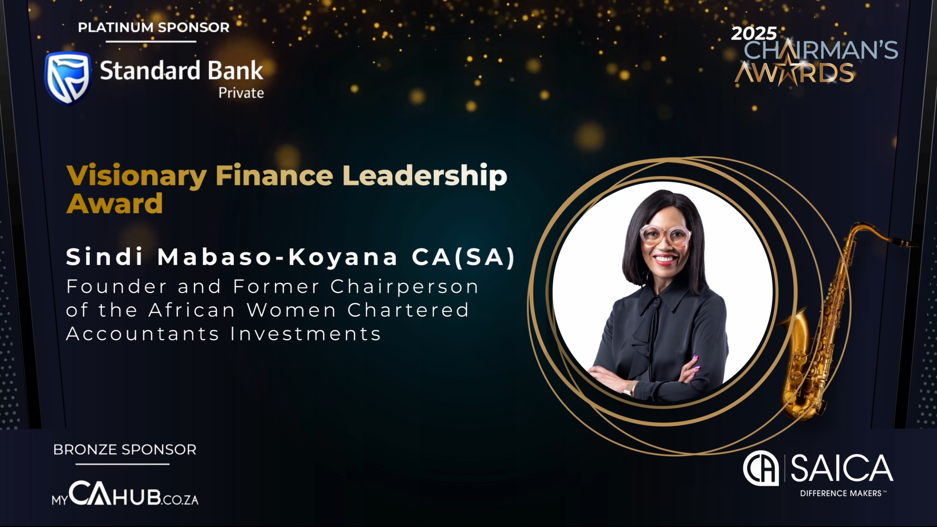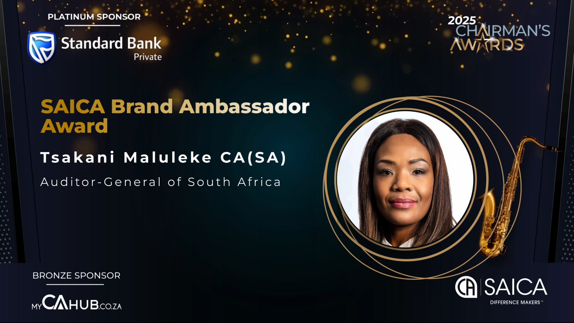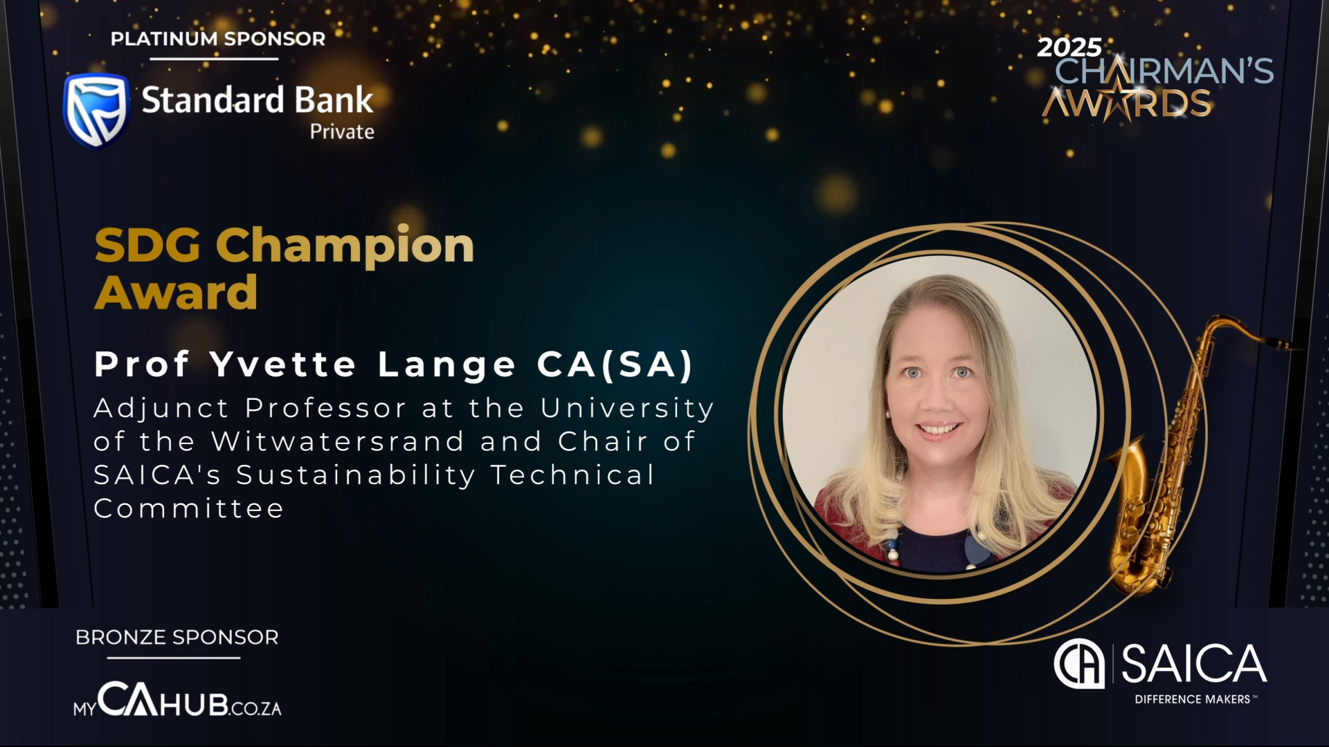 - SAICA Brand Ambassador Award: Actively promotes SAICA and its designations through branding, marketing and communication efforts, thought leadership or public engagement and/or has contributed to SAICA's development and advocacy efforts.
